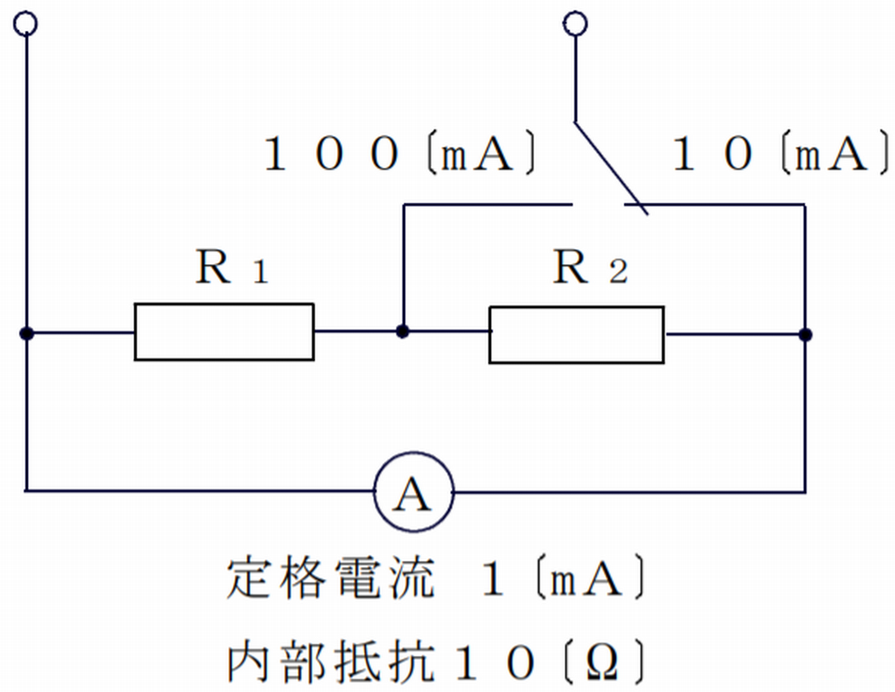 図に示す回路において、定格電流(最大目盛値)1 [mA] 、内部抵抗10 [Ω] の電流計Aを用いて、定格電流10 [mA] 及び100 [mA] の多重範囲電流計とする場合、分流回路の抵抗R1及びR2の組合せは、[ ]である。
