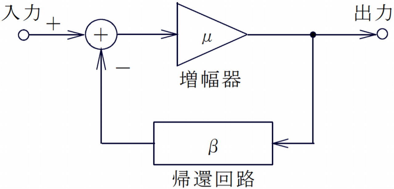 図に示す 負帰還増幅回路 において、増幅器の増幅度をμ、帰還回路の帰還率をβとすると、μβ≫1のとき、負帰還増幅回路全体の利得(閉ループ利得)Gは、G≒ [ ]となる。