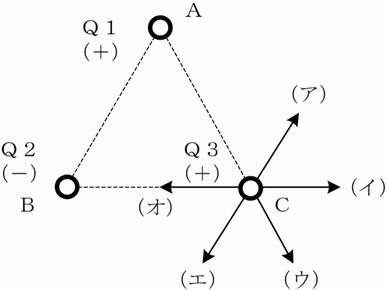 図に示すように、空気中においてそれぞれ同じ大きさの電荷を持つ帯電体A、B及びCを正三角形の頂点に置いたとき、帯電体Cに働く力の方向を示している矢線として正しいものは、[ ]である。ただし、電荷Q1及びQ3は正の電荷、電荷Q2は負の電荷を持つものとする。